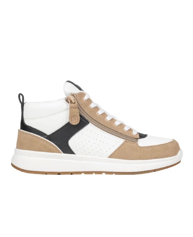 Billy White/Tan/Black Comfort DZ High Shoes Effortless style meets everyday ease with the Women's Comfort DZ High. Featuring a sleek colorblock design, this shoe combines faux leather and real suede for a sophisticated look and feel. The double zipper design on each side allows for quick and easy wear, while the cushioned interior ensures all-day comfort. Perfect for dressing up or keeping it casual, this versatile high top blends modern design with timeless appeal.
